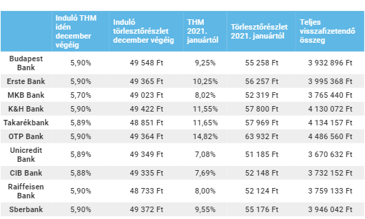 A Bank360.hu most összeszedte, hogyan változtatnak a bankok a THM-en január után. Kiderül, mennyivel kell többet fizetni havonta decembertől, de azt is kiszámolták, hogy mennyi lesz a teljes visszafizetendő összeg 1, 3 és 5 millió forint igénylése esetén.